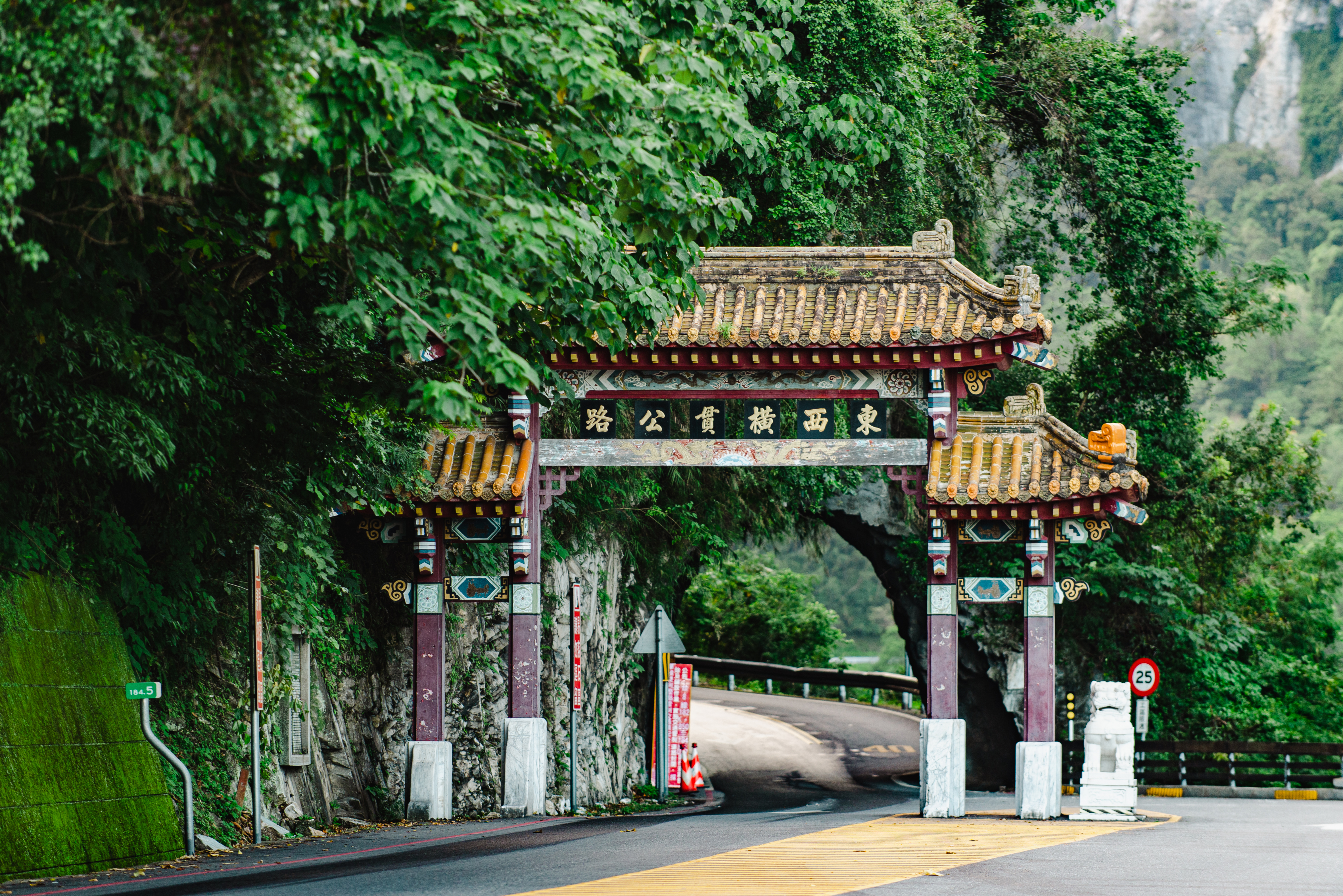 RC仿木結構北方宮殿樣式牌樓,四柱三間式的東西橫貫公路下方為木質梁枋屋瓦為黃色琉璃瓦,山壁設有碑誌歷史沿革,牌樓旁設置石獅。