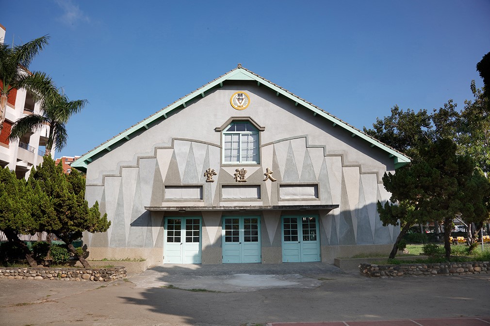 禮堂配置為一長方形平面格局,東西長向距離為 40.1 公尺、南北短向距離為15.3公尺,長寬比約為2:1。禮堂的台基與前方路面高差約25公分,設置兩層階梯,內外以門檻區隔內外。禮堂在初建時基礎使用磚疊砌,台基地坪則使用混凝土澆置,下方級配為鋪設卵石,表面以水泥砂漿粉刷。禮堂四面牆體為加強磚造,磚牆為本建築的結構主體,牆厚為39.5公分,在兩側牆體方面,其開窗與開窗之間均設有35公分寬的R.C柱,在橫窗下題有大禮堂的字樣。其空間格局可分成東西兩部份,前方西側為高度較高的主體空間,後方東側為較低矮的一層樓單坡水附屬建築,集會堂東側原設置有一舞台,目前已經遭拆除,準備室間的牆面採用和集會堂一樣的洗石子,其西、南、北內側牆面下層為高度24公分的洗石子踢腳,其台度共87公分,並與下層窗臺高度具一致性,並藉由延續的水平勾縫使其外觀成為一體。 原有舞台拆除後表面僅以水泥砂漿進行粉光,中間有高約22公分的原舞台洗石子踢腳。準備室牆面下層有高度24公分的洗石子踢腳,而天花板直接露出原有牆體。其風格類似西方的山牆立面。三角形的山牆中央嵌有青天白日的國民黨黨徽,見證當時黨國一體的特殊環境。集會堂主入口在西側開左右兩鐵捲門進入,南北側面在前後兩側分別設置鐵捲門以進入室內;準備室在南北兩側亦分別設置鐵捲門進入室內,集會堂與準備室間在左右兩側分別開有一單開的木門以連通兩者。 參考資料:原勝利國民學校禮堂調查研究修復計畫(2007)