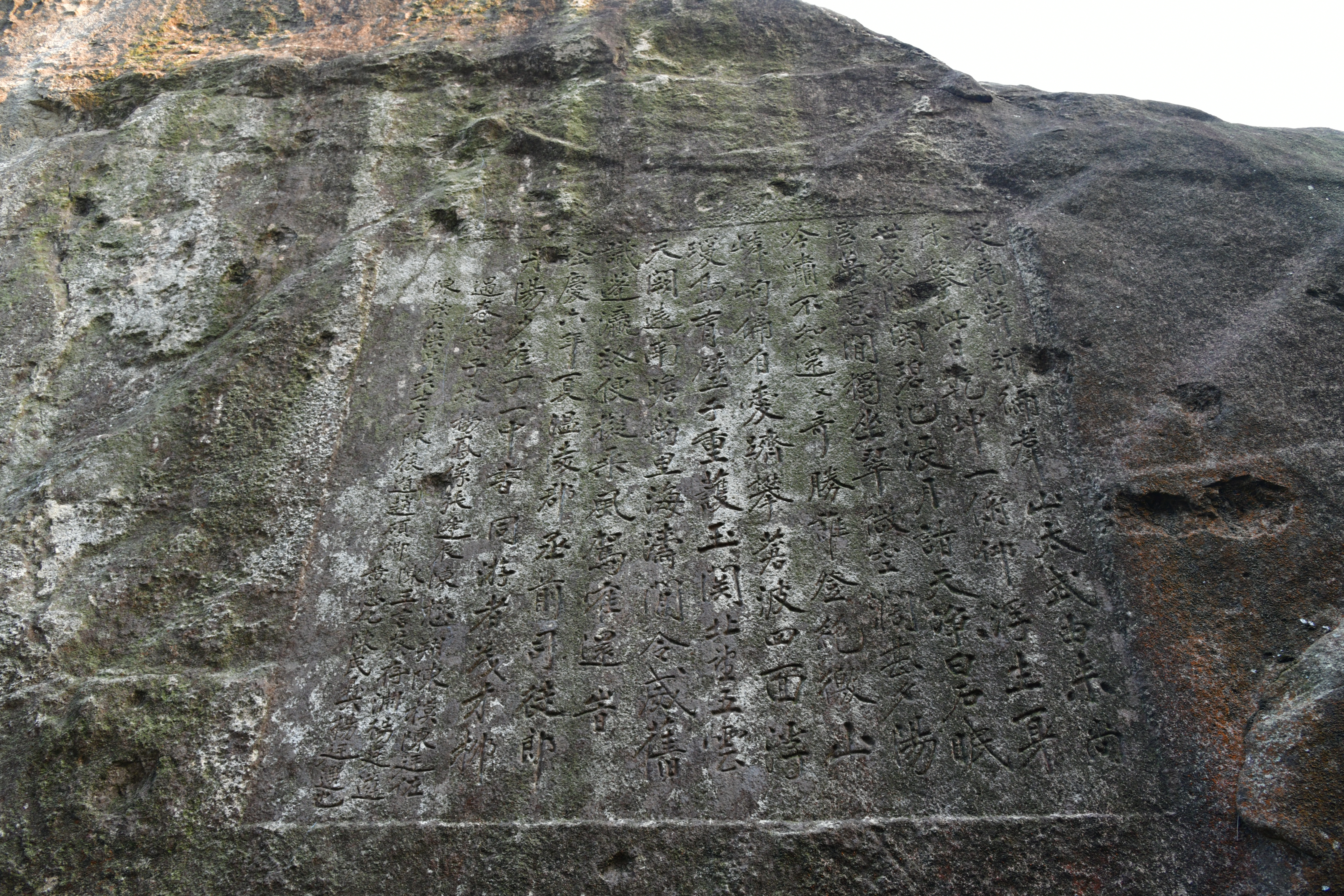 題詩碑構造方式為花崗石陰刻。 碑文:「泉南萍跡徧羣山,太武由來尚未攀。此日乾坤一俯仰,浮生身世幾間關。碧池浸月諸天淨,白石眠雲萬慮閒。獨坐翠微空濶甚,夕陽吟嘯不知還。 奇勝誰登絕徼山,嶙峋偏自愛躋攀。蒼波四面浮瓊島,青璧千重護玉關。北望五雲天闕遠,南瞻萬里海濤閒。令威舊識蓬瀛路,便擬乘風駕寉還。(註:底線為校正洪受《滄海紀遺》之記載。此書成書於隆慶二年,但為何會記載到隆慶六年的題碑,尚不得解。) 岁隆慶六年夏,溫陵郡丞前司徒郎,丹陽夕寉丁一中書,同游者茂才柳遇春、黃子燉(疑為檄)、楊鳳儀、張逢辰、陳懋翔、陳模、陳廷佐、陳玉合、蔡存淵、楊廷達、陳榮仁、洪昇、吳士彥、陳復道、趙碩卿、黃懋化、陳民獎、楊廷選也」(以上《滄海紀遺》未有記載)。
