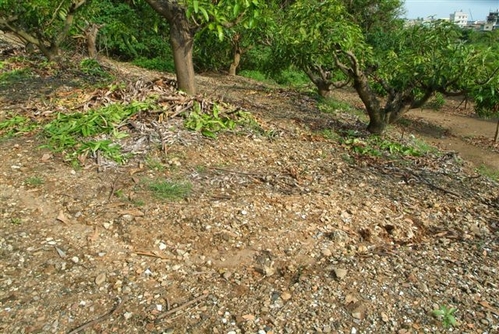 遺址現況分布有果園、植栽及墓葬等,地主自行維護其果園用地,日常維護人員清掃遺址範圍內產業道路垃圾,路旁雜草整修;大雨過後,易雜草叢生再另雇工協助日常管理維護人員共同清理,並注意排水情形及路面污泥清除,以維持排水通暢及環境整潔。