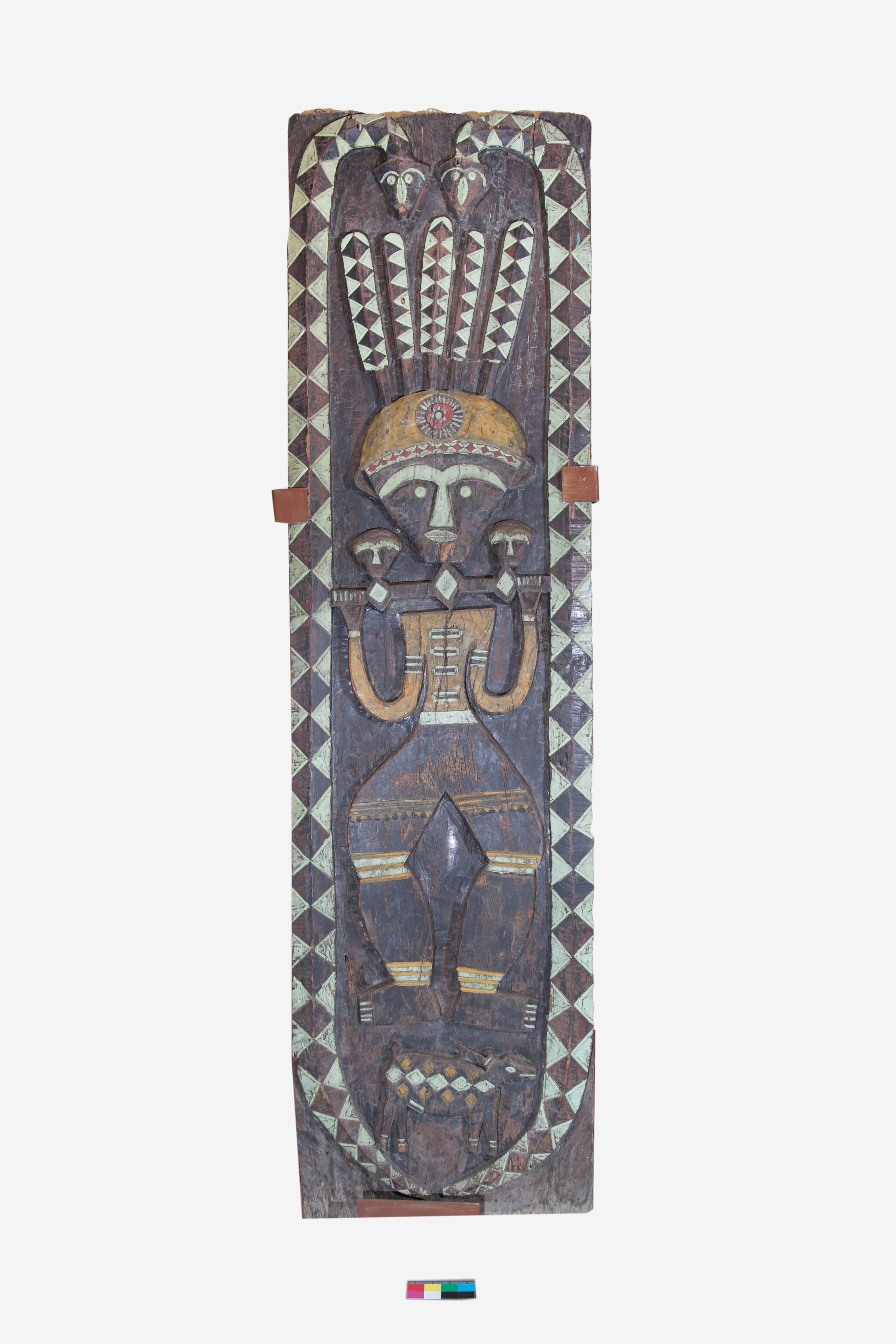 種類:木質雕刻 數量:1 年代:不詳 作者:不詳 材質:木 重量:34 kg 形狀:長型 尺寸:89 × 52 × 3.5㎝ 技法:雕刻