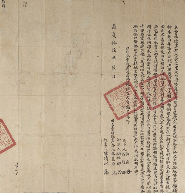 本件地契與今高雄市湖內區大湖開發史有關,年代久遠清嘉慶16年(1811),字跡清楚可讀。
