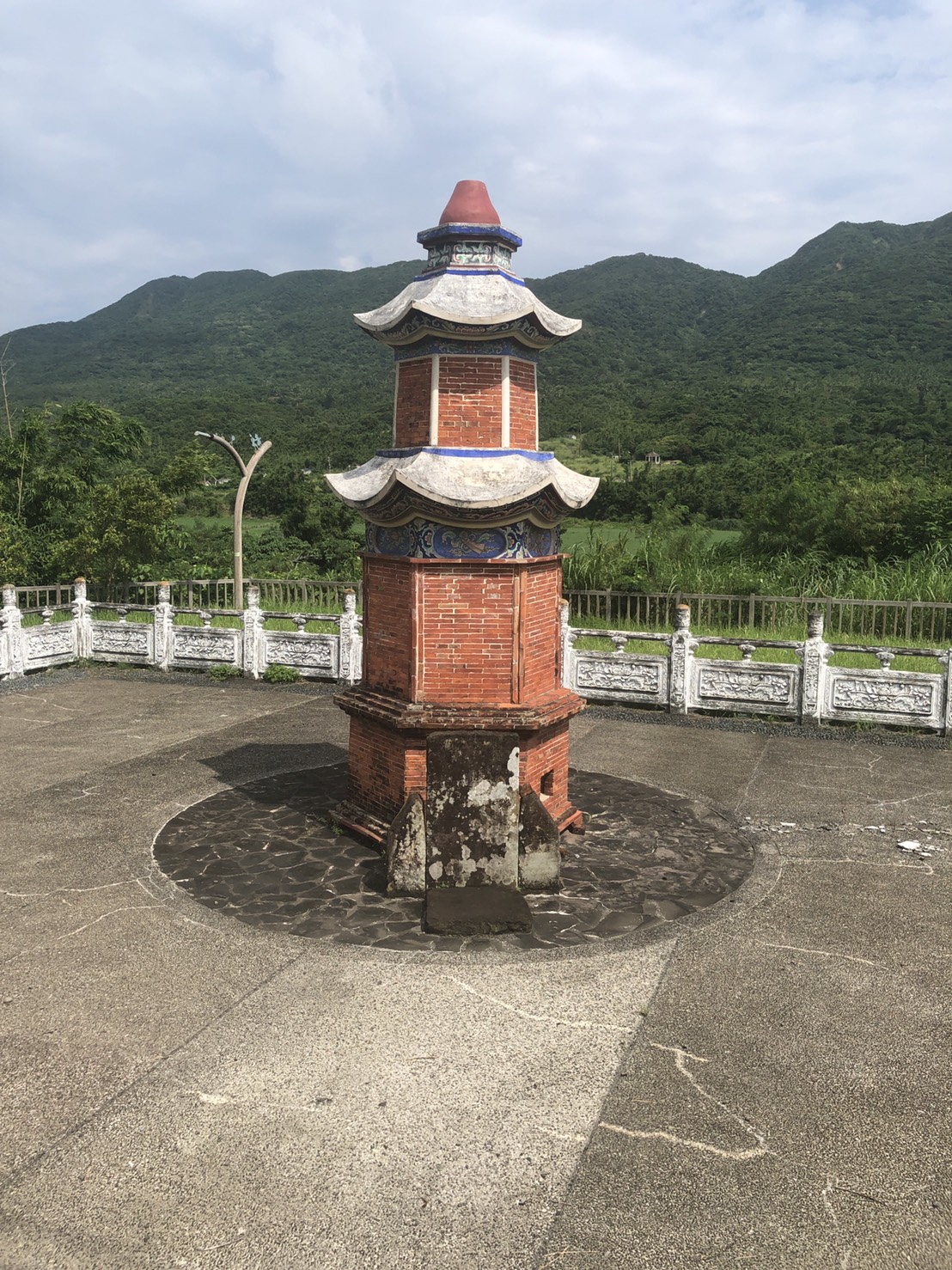 現水泥涼亭及牌樓石碑的屋頂,其材料與材質均為突兀,建議調整更換為素面的土燒筒板瓦,至於亭桿之支柱可改為接近石材的顏色。