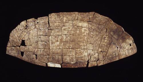 1936年殷墟第13次發掘所得,屬武丁時代卜辭。是大龜背甲的右半邊,一般卜用的龜背甲,都是從中央剖成兩半再使用。本件為所藏最大且完整的背甲,背面有許多寫而未刻的硃書字跡,還有一些書而後的卜辭,刻過之後,還看得見硃書的痕跡,筆畫中間且填上墨色。