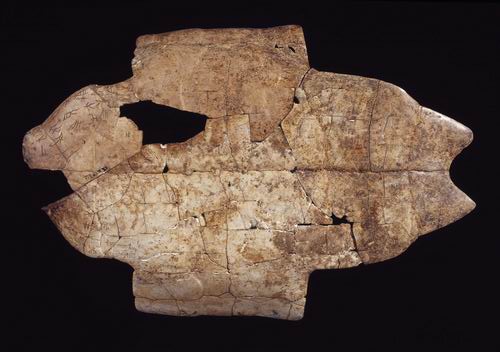 有損傷但狀況穩定 (1.經粘合;2.龜首殘1/3;3.中間近左甲橋殘一塊;4.表面裂痕多處;5.右甲橋邊緣剝蝕;6.背面多處表皮剝蝕)