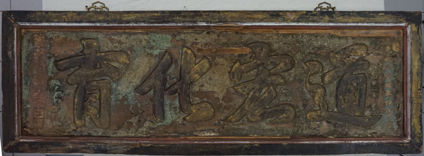 「嘉邑城隍廟道宏化育匾額」目前存放於嘉義城隍廟教學大樓二樓文物保存室,保存狀況良好。