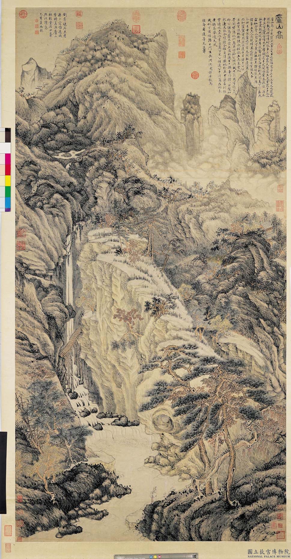 沈周(1427-1507)字啟南,號石田,生於江蘇長洲(今蘇州),出身於士紳之家。他終身未追求仕進,致力於詩文書畫的創作,除了豐富的學養,溫雅寬厚的品格也備受時人尊崇,是蘇州文人文化承先啟後的重要人物。由沈周、文徵明等所建立的繪畫風格依其地域而通稱為吳派,影響深遠,成為文人畫風的代表。畫家在畫上以篆書題寫「廬山高」,點明本幅的主題。他透過山石的結組與堆疊,盤迴出由兩側向中央集中的聳峙山峰,而前景微小的人物更襯托出主山雄渾、仰之彌高的印象。由題辭中可知,沈周藉此畫為其師陳寬祝壽。陳寬家族原出於廬山所在的江西,後來寓居蘇州,與沈周家族淵源深厚。廬山高的形象婉轉表達出高山仰止之深意。據畫史記載,沈周早年多為小景,四十歲以後始作大幅畫,本幅恰好成於他四十一歲之際(1467),是此時期的代表作品。先以淡墨皴染、再用濃墨點提的作法,細密攢簇的皴筆,步步疊高山塊以營造湧動山勢的構圖方式,在風格上都接近於王蒙。但相較於王蒙畫中的強烈動感,此幅畫作卻顯得較為平和穩定,在蓬勃生氣中透露出沉穆靜雅。此外,畫面的構圖原則轉趨抽象與平面化,山水元素的組合也傾向於追求偃仰多姿的視覺韻律感,更勝於對自然的忠實描繪,都是運用王蒙風格所創發的新面目。