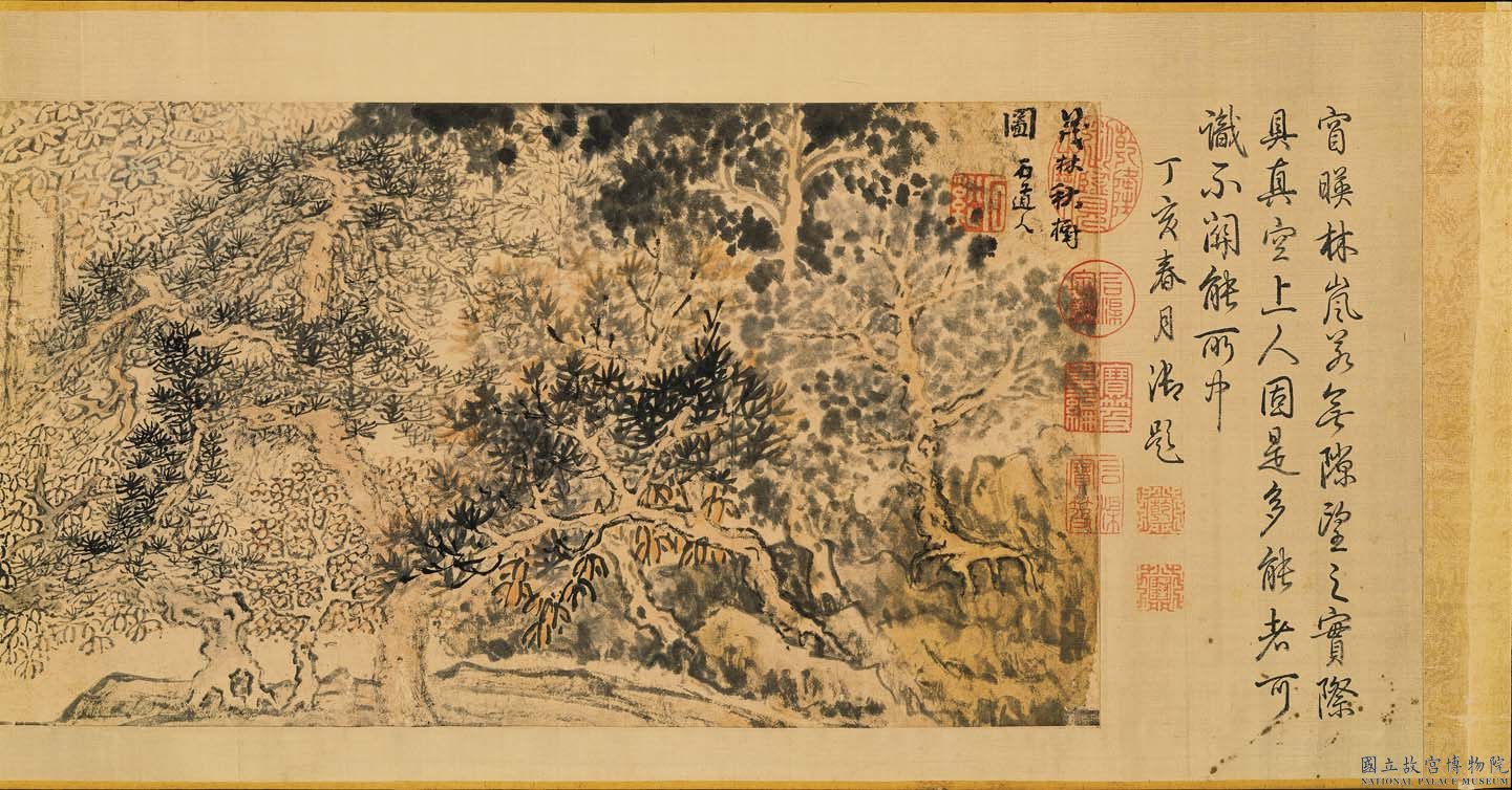 石谿是明末清初四高僧畫家之一,他的繪畫顯露兩方面的傳統,一是率意不羈,所謂「粗服亂頭」的禪畫傳統,一是興於十四世紀元代,重視抒情寫意的文人畫傳統,如黃公望以書法的線條再現山石樹木,或如王蒙繁密蒼鬱的構圖。此幅畫用筆繁複,提頓轉折看似率意,實具法度。墨色燥溼並濟,濃淡相間,樹石著淡赭色、石綠,偶而用重色敷填夾葉,在平淡中,透露出些許秋意。畫中大約用了十幾種畫樹葉的方法,但不外乎點葉和夾葉,虛實相生,所以顯得密而不滯,豐富而多變化。若以瀑布為界,右幅著重於描繪茂密的秋林;左幅以山石為主,遠樹為輔,兩段都沒有向後延展的遠景,樹石都近在眼前,讓人彷彿置身在一片茂林巨石的景物之中。卷首右上角款題:「茂林秋樹圖。石道人。」前隔水有清乾隆帝1767年的題詩,指出這幅畫雖然充滿樹石,不見空隙,卻能運用煙嵐表現空靈的感覺。二十世紀後期,清初四僧在畫史上的地位得到進一步肯定。四僧不僅傳承宋元,同時開拓畫境,相較清初固守臨摹的畫家,尤具時代意義。本幅「茂林秋樹」為石谿山水畫代表作之一,具現石谿融會黃公望、王蒙筆墨的功力,是出入古人的佳作,符合「古物分級登錄指定及廢止審查辦法」第四條第一項第一、三、四、六款,指定為國寶。