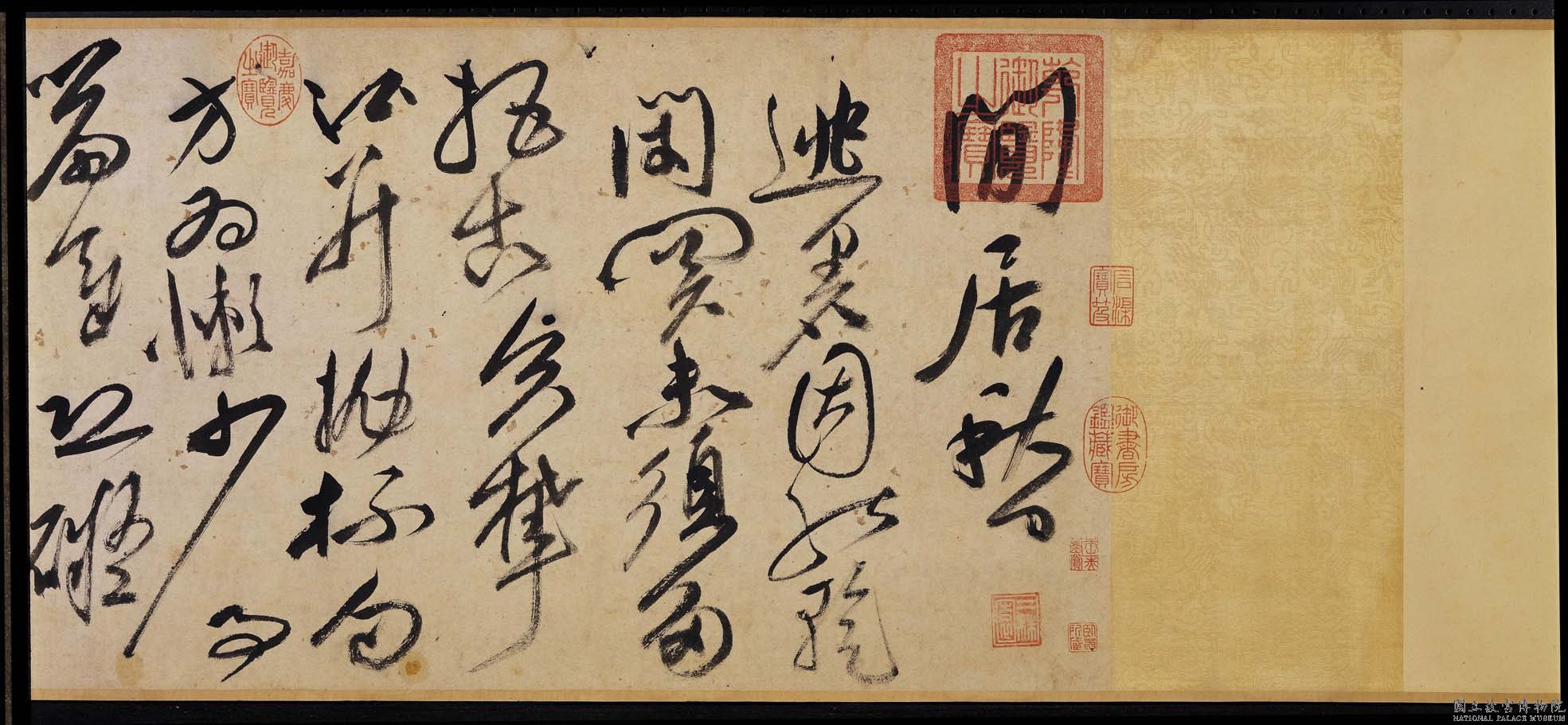 祝允明(1460-1526),字希哲,號枝山,長洲(江蘇吳縣)人,與唐寅、文徵明、徐禎卿並稱吳門四才子。因生來右手六指,故號枝山、枝指生。自幼聰穎,詩文富有奇氣。他的書法早年受其外祖父徐有貞影響,後廣泛學習古代名家,融會貫通而發展出獨特書風,又以狂草著稱。曾任廣東興寧知縣,遷應天府(南京)通判。著有《懷星堂集》等書,並編《興寧縣誌》。此作書於祝允明六十六歲之時,全篇以草書寫成,共四首七言律詩:〈閒居秋日〉、〈宿茅峰〉、〈宿金山寺〉、〈句曲道中〉,詩文收錄於《懷星堂集》。每首詩的題目書寫於前,四詩書畢,題曰:「乙酉秋日叢桂堂酒次書。枝山道人。」作品外觀上不脫狂放氣息,然而貫穿全篇卻是相對嚴謹的創作方式,反映出祝允明深厚的傳統書學涵養。書寫過程中,今草與狂草並用,但是並沒有過度癲狂的用筆或誇張的結字,字裡行間展露更多祝允明對筆法的操控力、獨特的結字習慣與整體的行氣變化。憑著收放自如的書寫技巧與紮實的書學功底,加上個人對藝術的敏銳度,祝允明在草書創作上達到了極高的藝術成就。