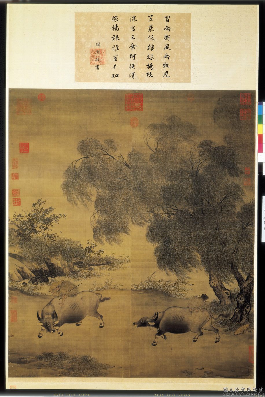 李迪,生卒年不詳,錢塘(今浙江杭州)人。南宋孝、光、寧宗三朝(1162-1224),曾任畫院祗侯。擅長寫生,描繪花鳥、走獸、竹石,細緻生動,畫風清新。首先看到這幅畫時,灰濛濛的天色,輕籠的烟霧和倒向一邊的柳枝、蘆葦等,就點出了風雨交加的氣氛,再細看兩位牧童騎在牛背上,牛隻吃力地頂著風前行,便知應是黃昏時分踏上歸途,卻遇上了狂風驟雨的情景了。走在前方的牛面對強勁的風雨,在側著身來抗衡的同時,回視著後方,背上的牧童則低頭扶著斗笠,緊握著鞭子來抵擋;後方的牛有了些許屏障,可以正面迎對風雨,卻也必須壓低身子,奮力地走著,而背上的牧童不慎被吹落了斗笠,顯得有些不知所措,或許這也是吸引前方牛回首之因。本來二牧童的姿態是相背的,但這一回首,卻使前後間有了互動,頗具戲劇性。幅中畫樹石的用筆勁健有力,筆意較為疏放,但畫人物、牛隻、柳樹和蘆葦則工整細緻,尤其人物的蓑衣、牛毛和飄搖的柳葉、蘆葦均以細如針、密而不亂的中鋒筆法畫成。並充分掌握物理,如先鉤畫出牛壯碩的身型,描畫筋骨結構,再用墨多次渲染牛腹,突顯立體感,後絲出牛毛的質感,於是所畫的對象便逼真生動地出現在畫面上。故縱觀全幅,實令人嘆賞畫家寫實寫境的深厚功力。