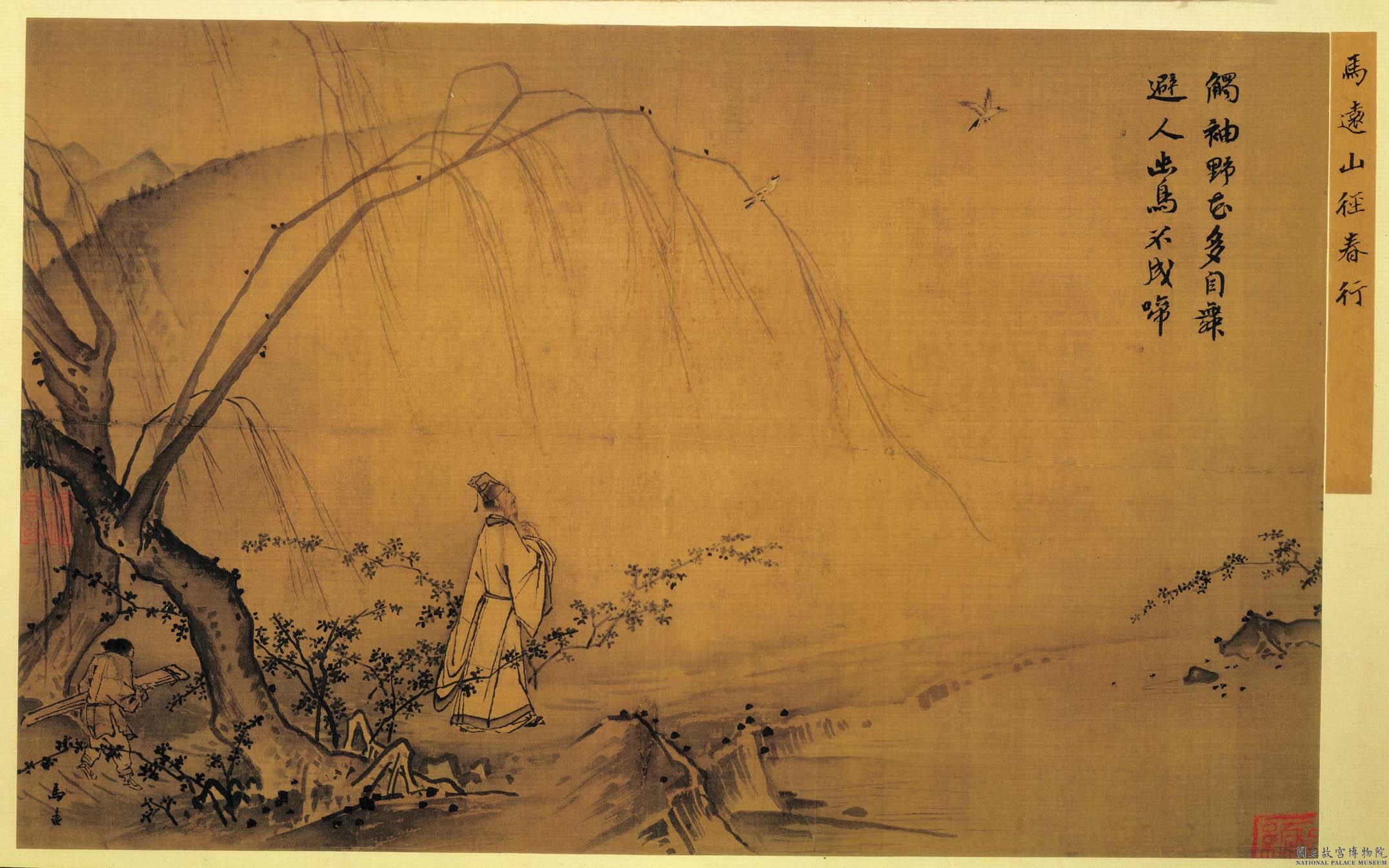 馬遠出身於繪畫世家,從其曾祖到兒子,五代之間有多人在畫院中任職,其中尤以馬遠與馬麟父子的成就最高。馬遠在南宋光宗至寧宗朝(1190—1224)時擔任畫院待詔,兼擅山水、人物、與花鳥,但以山水畫最為見長。他的山水畫承自家學,和李唐(約十一世紀中-十二世紀初)的風格也有淵源,與夏珪並稱為「馬夏」,同為南宋畫院的代表畫家,將北宋堂堂山水中厚實飽滿再現自然的山體,轉化為尺幅空間裡清曠空靈抒情詩意的氣息。本幅有畫家名款,是具有馬遠典型畫風特徵的重要代表作之一,描繪高士拈鬚,緩步微吟於春日河濱。物象多集中於畫面的左下側,正是使馬遠獲得「馬一角」之名的斜角構圖。畫樹石以粗濃墨線鉤輪廓,再以側筆作斧劈皴,表現坡岸石塊堅硬的質地。從近景到遠山,墨調的變化細緻而微妙。長條柳枝搖曳輕舞,也是他所常用的拖枝技法。向前延展的柳枝、斜向退後的坡岸、以及高士的視線,似都引導觀者看向空茫前方,跟隨他體察靜謐自然中黃鶯驚起的片刻。留白處所題「觸袖野花多自舞,避人幽鳥不成啼」,也突顯出畫家所要補捉的詩意氣氛。自北宋末徽宗鼓勵院畫家在畫中融入詩境,漸成風氣,詩畫互相激盪,更能激起觀者的共鳴,餘韻無窮。當時院畫多見宮室帝后題字,如本件即出自寧宗之手。