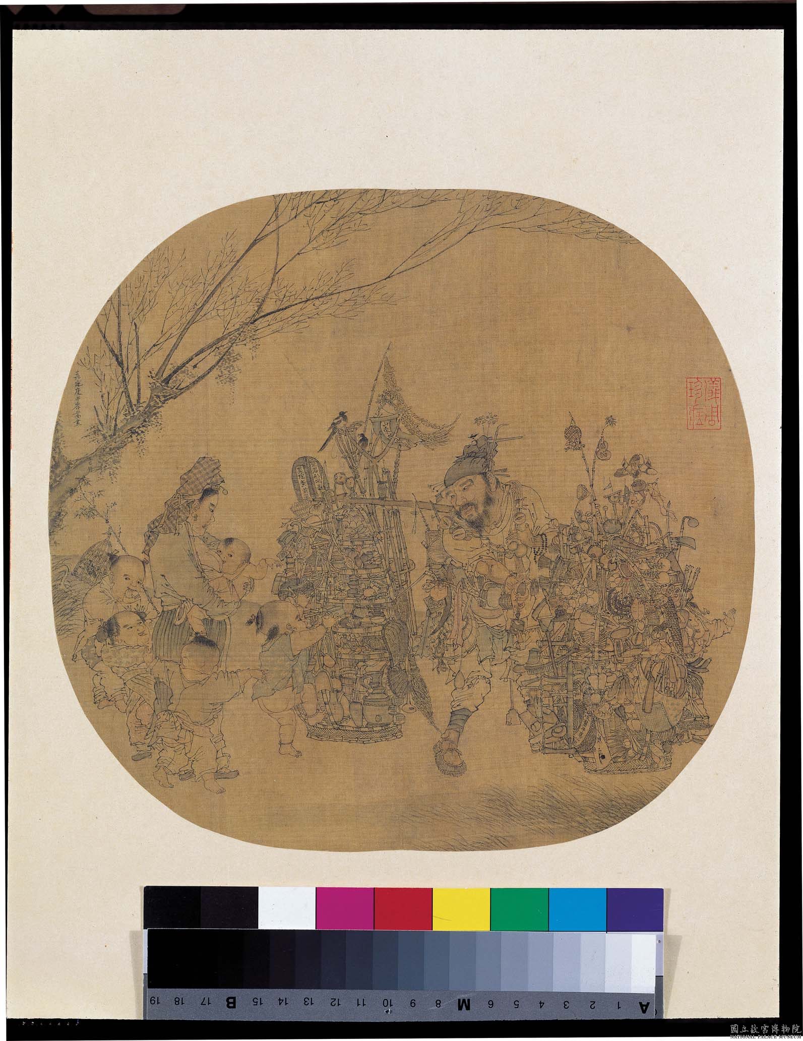 李嵩生卒年已不可考,大致活動在南宋光宗、寧宗、理宗三朝(1190-1230)。錢塘人,年少時,家境貧苦,曾做過木工。後來被紹興畫院名畫家李從順(約活動於1120-1160)收為養子,將畫藝全部傳授給李嵩。李嵩擅長畫人物、山水、花卉,又以界畫聞名,由於他曾受過木工的訓練,畫界畫可以不用界尺,就能將線條畫得規矩齊整,是南宋畫院中最好的畫家。由於李嵩生長在民間,對身邊周遭事物體驗深刻,因此筆下人物,大多以江南景物及農村生活為對象,如《市擔嬰戲圖》即是描寫貨郎到鄉下賣貨的情景。貨郎是宋、元時期,來往於城鄉之間,販賣日用雜貨和兒童玩具的挑擔小販。畫中,一名滿載百貨雜物貨郎,手搖博浪鼓,沿街叫賣,孩童們聽見了博浪鼓聲,急急忙忙地將母親前呼後擁地推到貨郎擔前,也不等貨郎將擔子放好,便搶先上前要挑選自己喜愛的東西,將原本寧靜的鄉野染上了喧鬧的氣氛。貨郎擔上物品琳瑯滿目,不只有斧頭﹑鋸子﹑木耙等農具,還有許多日用品、食品,更有標了名稱的貨品,如「仙經」、「文字」、「攻醫牛馬小兒」等等,更有大量的童玩,甚至還有喜鵲、八哥、青蛙這些活的動物,不只展現高超的畫藝,更藉由活潑寫實的人物,表現畫家對鄉土人物的熱愛與關懷。