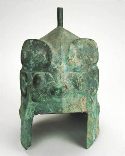 盔形,頂端略尖,盔身成圓筒狀,頂中有一圓管,前有長方形缺口,正面飾雙捲角獸面紋,無眉,雙眼和鼻端圓突,兩側有圓渦紋,紋飾中有一孔,遍體綠銹,底部殘破。