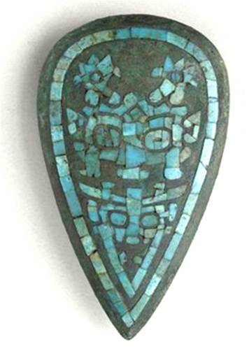 杏葉形薄片,似小盾,上端弧形,下垂至末端 聚成一尖。背面凹入,有一扣環,正面周邊鑲綠松石一圈,上段飾星獸面紋,下段為三角獸面紋。