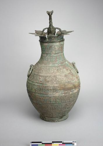 「八瓣華蓋立鳥圓壺」出土一對,是戰國時期出土遺物中極為精美、別緻的銅壺,立鳥、蓮瓣均以鏤空鑄成,立鳥的雙翅可自身體卸下,整隻立鳥也可以自蓋頂取下,設計極富巧思,器壁滿布墊片,說明當時的青銅工藝技術,具有重要歷史、文化、科學、藝術價值。