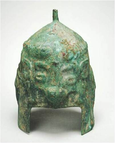 盔形,頂端略尖,盔身成圓筒狀,頂中有一圓管,前有長方形缺口,正面飾雙捲角獸面紋,無眉,雙眼和鼻端圓突,兩側有圓渦紋,紋飾中有一孔,遍體綠銹,底部殘破