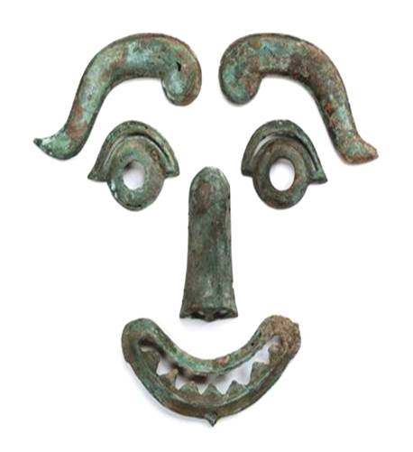 計有眉、目、口、鼻六件。眉彎而長,目微鼓,中央有一圓穿,目上附加一曲線若睫毛狀,隆鼻,鼻下有二孔,口大張,弧彎形,有齒七個,全部配合成人面形,表面生綠銹,沾泥。