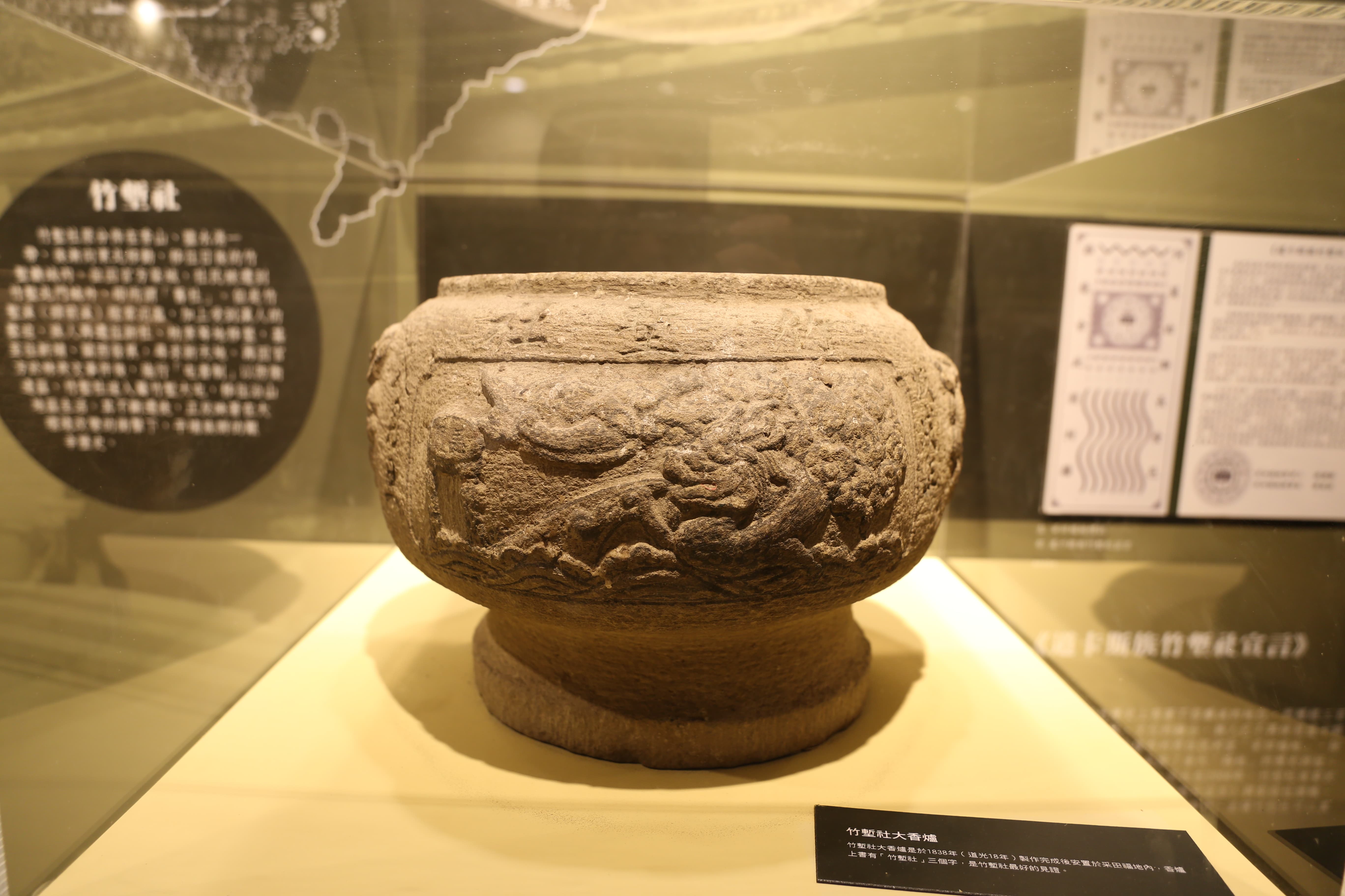 古物製作史與特徵 采田福地為道卡斯族竹塹社奉祀七姓之歷代祖先之祠堂,祠堂於清道光十八(1838)年增祀地神富媼(番仔王爺),並安置石造大香爐。此物件即為當時所置之香爐。 香爐本體為砂岩石材打造,爐身尚留有斧鑿痕跡,爐體為圓形,束腰、平底,爐身直徑40公分、高28公分,正面中央浮雕「鯉魚躍龍門」,龍首朝左,下方為水波,左側有禹門。浮雕框線上方陰刻「竹塹社」三字,右側陰刻「戊戌年」三字,左側陰刻「八月旦」三字;爐耳部分浮雕獅頭。整體雕刻為粗曠風格,確為清代所留下的石爐,具有歷史意義。 戊戌年為清道光十八(1838)年,本古物確為當時所打造,見證竹塹社逐漸漢化而開始燒香之歷程,極具歷史意義。 古物相關之人物、事件 道卡斯族竹塹社人原居住於竹塹,因漢人之墾拓,遷至舊社一代,後又因水患而遷至新社。1797年建新社公館,即新社公館,又稱番仔祠堂。一方面做為徵收番大租之課館,一方面做為祠堂,奉祀七姓之歷代祖先及福德正神。廳堂懸掛1760年敕賜乾隆帝御筆之「特封義勇可嘉」匾額,清道光十八(1838)年增祀地神富媼(俗稱番仔王爺),並安置石造大香爐。此後道卡斯族逐漸漢化,原有祭祀習慣逐漸改變,語言文化亦消失。 族人於1987年重修采田福地公廳,左側加祀「大成至聖仙師孔夫子之神位」及香爐,正中安奉神龕上刻有「蕃釐保障」之地神富媼,右側安奉七姓歷代始太高曾祖考妣神位總牌。神桌下改為奉祀「虎爺」,前方下桌奉祀村民新彫刻之土地公暨地公婆神像。雖然每年按時於農曆七月十七日祭祖,但已採客家習俗,僅留下采田福地古蹟及石香爐古物為歷史證物。 歷史古物文化意義 本古物為清道光十八(1838)年為祭拜地神富媼之祭祀用具,本身具有歷史價值,而古物本體之造型及雕刻文字,見證了清代道卡斯族竹塹社由原住民族逐漸漢化的過程,也見證祖靈信仰文化的變遷,為新竹縣不可或缺的歷史證物。 資料來源:新竹縣政府文化局