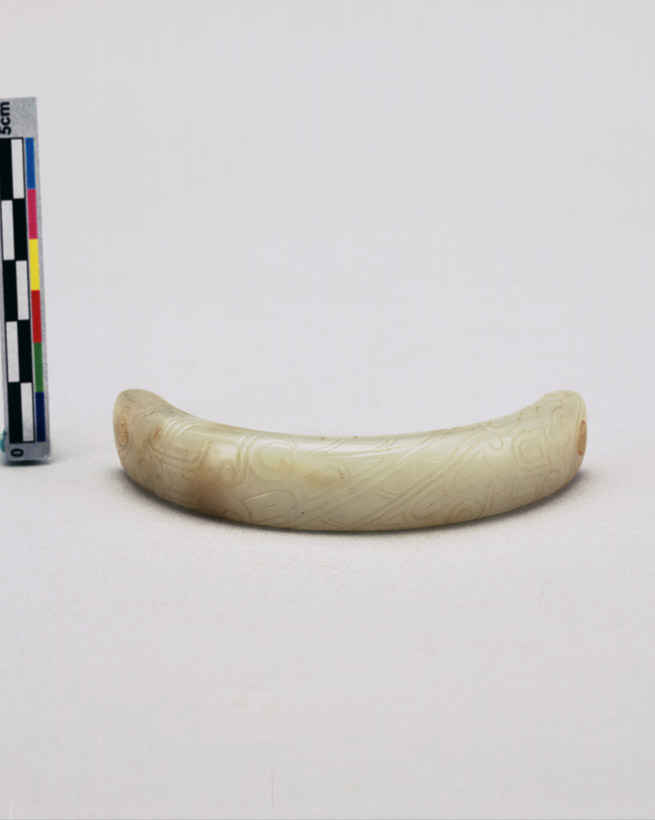 器為弧狀,兩端有孔,外面刻有帶目文之文飾兩組,色白,微有斑。