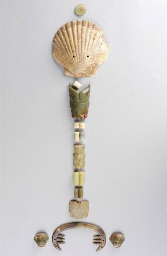 玉圓片:主要材質為閃玉。徑1.4公分、厚0.4公分,重4.3公克。雙穿孔海扇蛤當盧:材質為海扇蛤。長12.3公分、寬12.2公分,重71.2公克。 玉管(1):主要材質為閃玉。長1.5公分、徑1.1公分,重3.1公克。 立雕牛首玉飾:主要材質為閃玉。高7.4公分、寬4.6公分、厚1.5公分,重74.4公克。 深綠色,全器作牛頭狀。反面微凹有五孔:兩角中心頂端一孔、兩耳縫間各一孔、兩嘴角縫間各一孔,五孔斜穿至外側。 玉管(2):主主要材質為閃玉。長1.2公分、徑1.1公分,重2.6公克。乳白色,無紋飾。 玉管(3):主要材質為閃玉。長1.2公分、徑1.1公分,重3.1公克乳白色,無紋飾。 玉管(4):主要材質為閃玉。長2.0公分、徑1.0公分,重3.7公克。灰白色,無紋飾。 玉管(5):主要材質為閃玉。長1.7公分、徑1.1公分,重3.7公克。灰綠色,無紋飾。 立雕鳥形玉飾:主要材質為閃玉。長5.1公分、寬2.7公分、厚1.2公分,重20.8公克。淡綠色,作鳥形立雕,其視角為自背部俯視,尾部特大,兩肩及尾端兩邊各有一孔,共四孔。 玉管(6):主要材質為閃玉。長2.8公分、徑1.2公分,重7.6公克。淡綠色,無紋飾。表面附有少許硃砂。 玉管(7):主要材質為閃玉。長2.9公分、徑1.1公分,重6.9公克。淡綠色,無紋飾。表面附有少許硃砂。 玉管(8):主要材質為閃玉。長2.1公分、徑0.9公分,重3.21公克。暗綠色,無紋飾,管心偏於一邊。 玉管(9):主要材質為閃玉。長2.1公分、徑0.9公分,重3.3公克。暗綠色,無紋飾。 立雕虎首玉飾:主要材質為閃玉。高3.7公分、寬4.3公分、厚0.8公分,重26.8公克。淡綠色,整個器形為一虎首,正面為雙線刻紋,背面為單線刻紋。頂端有二小孔,嘴縫中兩孔斜穿至外側,破壞了背面獸面紋之兩眼。 玉馬銜:主要材質為閃玉。徑11.5公分、厚0.6公分,重31.5公克。赭綠色,全器成橢圓形大半環,兩端尖銳,兩端內側各有三齒,尖端部份有兩孔。 立雕人首形鑣(1):主要材質為閃玉。高3.0公分、寬3.3公分、厚1.3公分,重15.2公克。綠色,有雜質,全器作人面形,背面呈凹狀有兩孔相連。 立雕人首形鑣(2):主要材質為閃玉。高3.0公分、寬3.2公分、厚1.4公分,重15.8公克。綠色,有雜質,全器作人面形,背面呈凹狀有兩孔相連。