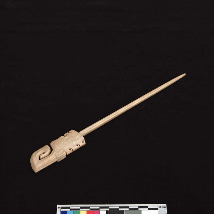 殷墟考古出土組件式玉笄不多見,此件出土於小屯C156號探坑。笄首與笄身兩段製造,以榫卯相接。笄首為一人頭側面文飾,笄身呈長形針狀,具有重要歷史、文化價值。