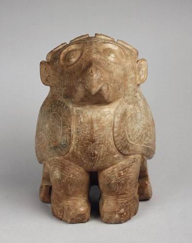 立體雕刻,保存尚佳,左角中部及左上角損缺小部,右耳右角表面微風化,胸下部兩足爪,右尾下部,喙上面亦微風化。