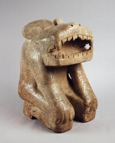 立體雕刻,頭略上仰,突出身外,巨口 大張,凹入甚深,齒牙如鋸,鼻在口上有兩小孔;兩眼如形居左右;其後有兩耳,豎立如扇,頭部下胸腹凹入,前肢由頭旁伸出置於膝上,有五趾;後腿屈曲作蹲鋸狀,底部中分為二似溝,後背由耳下直達底部,有槽一道。通體雕飾花紋,白灰色雜黃。