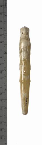 圓錐體,主體部份形成一鳥形立雕。翅膀延伸至背部交叉。鼻、足、翅有浮雕文飾,鼻部有一穿孔,尾部兩孔對穿。