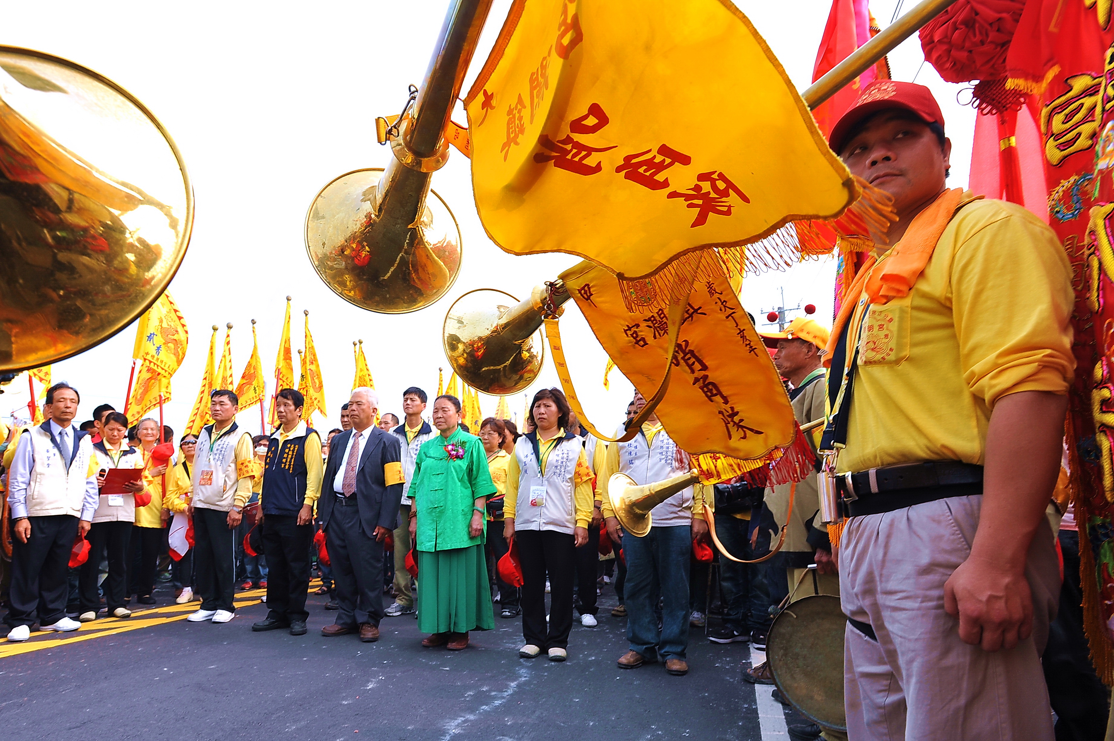 媽祖起駕出發、前往新港進香的儀式。按例先在大轎前焚香跪拜,恭請媽祖起駕並庇祐眾隨駕進香人員一路平安。待起駕時辰一到,點燃三響「起馬炮」,同時廟內鐘鼓齊鳴,轎班將媽祖神轎抬起,由報馬仔先行,進香隊伍正式出發。