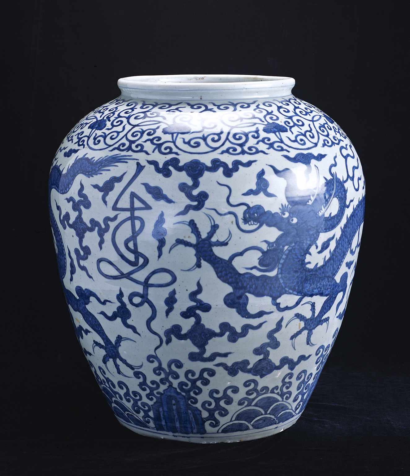 本件有「大明萬曆年製」款,具有時代特色;器形大而完整,壽字紋及龍紋風格明顯,具有文化藝術研究價值。