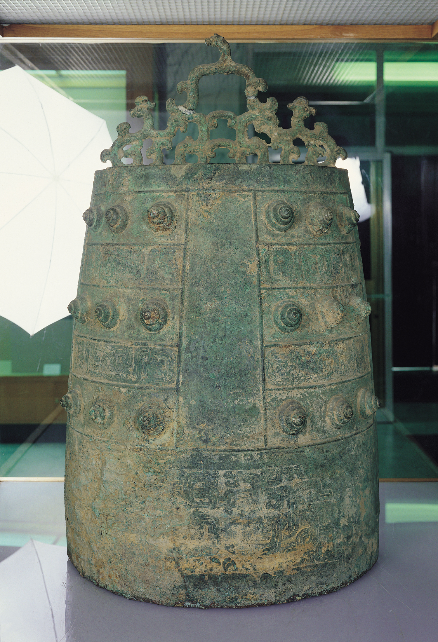 此器為河南新鄭出土,屬鄭公大墓遺物,為春秋時代中原地區的重要樂器。鎛鐘為單懸,大都只有一件,但新鄭鄭公大墓竟出土了大小不等的4件鎛鐘,此為其中次大的一件,亦為臺灣現藏最大的一件,彌足珍貴。鎛鐘體型巨大,呈合瓦形,上面有懸鈕而于平,掛起時直垂,下沿與地面齊平。上面的懸鈕,飾以鏤空蟠螭紋飾,所以稱為螭鈕鎛鐘。鎛鐘為低音鐘,演奏作合聲和掌握節奏之用,具體呈現了春秋時代鄭國音樂「鄭聲」的遺緒,具有重要歷史、文化價值。