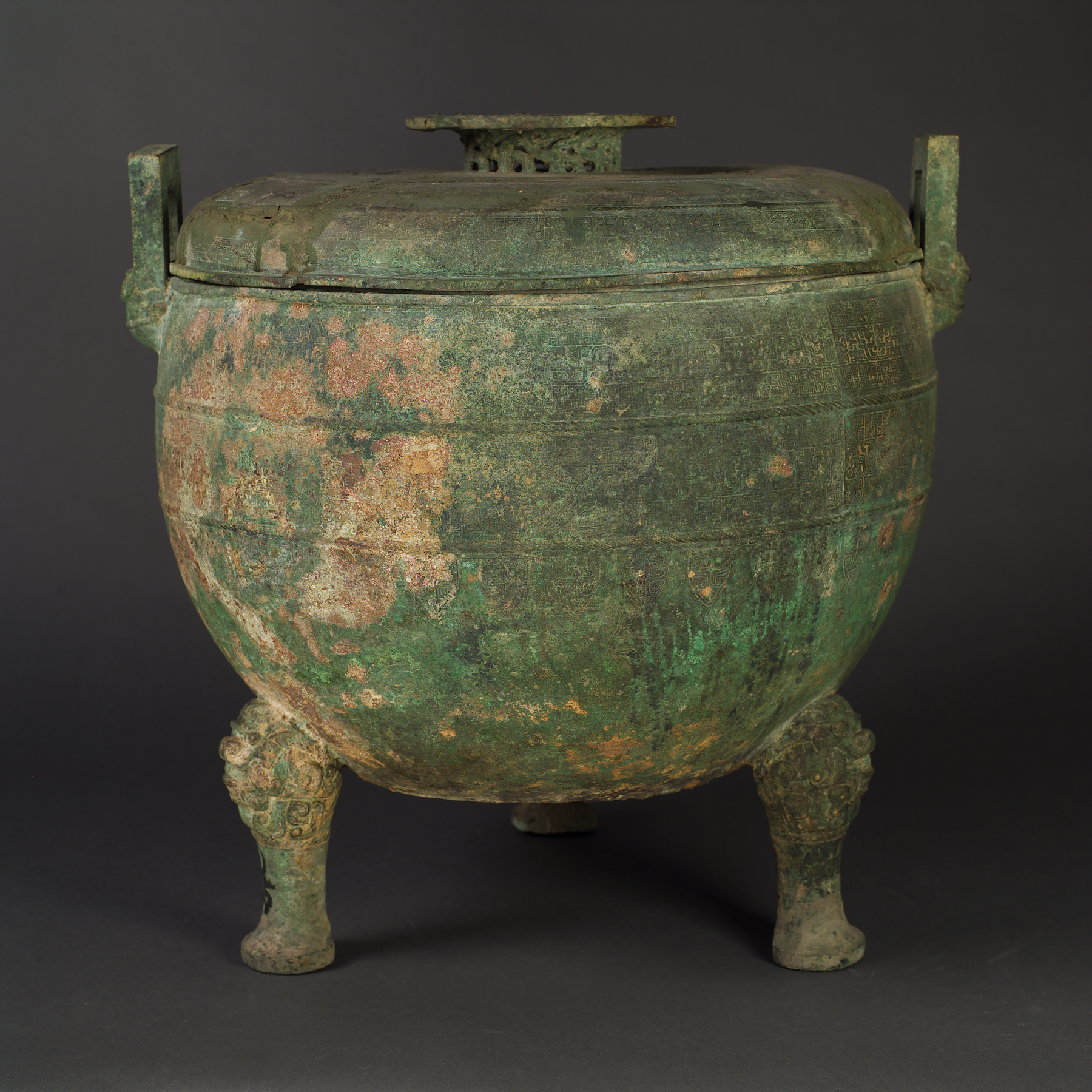 鼎為商周青銅器中最重要的青銅禮器,用於宗廟祭祀與饗宴。此器為河南新鄭出土,屬春秋中期中原鄭公大墓遺物,原著錄為三短足兩附耳,斂口鼓腹,上承圈頂蓋,蓋鼎捉手立柱浮雕成立體蟠蛇紋,鏤空交叉纏繞,為典型之新鄭式蟠蛇紋飾。此種有蓋箍口圓鼎式樣,是春秋時代中原地區最早出現的典範之一,具有重要歷史、文化價值。