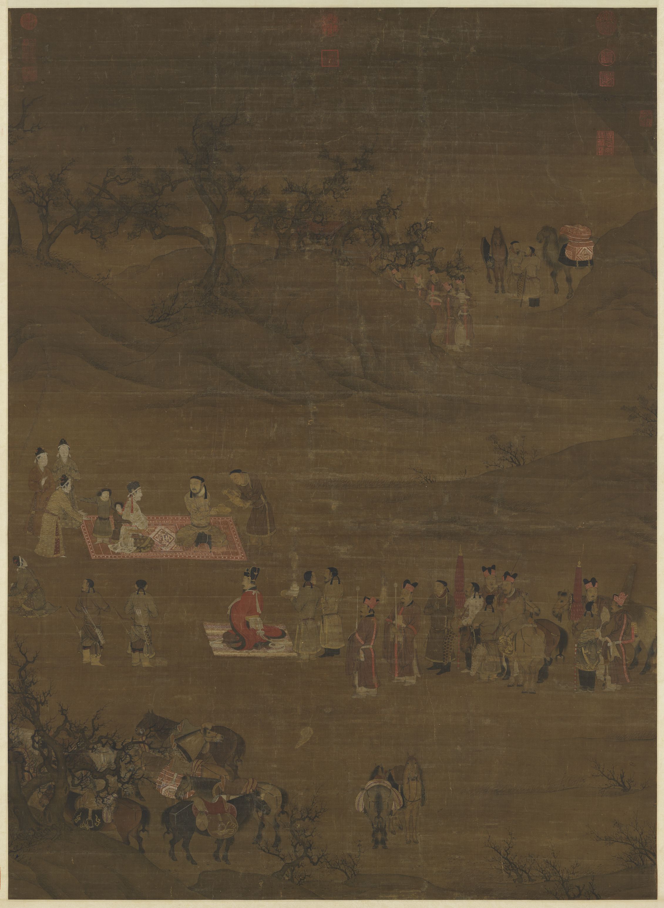 本幅無作者款印,舊傳為陳居中(12-13世紀間)所繪。此一題材在南宋初屢可見及,原因是北宋滅亡時,徽、欽二宗一干后妃們,均遭金人所挾持。情況和蔡文姬(162-229)當年的際遇,頗有侔合處。描繪文姬歸漢故事,藉扥古以喻今,正好呼應了南宋朝野祈盼皇帝歸來的心情。