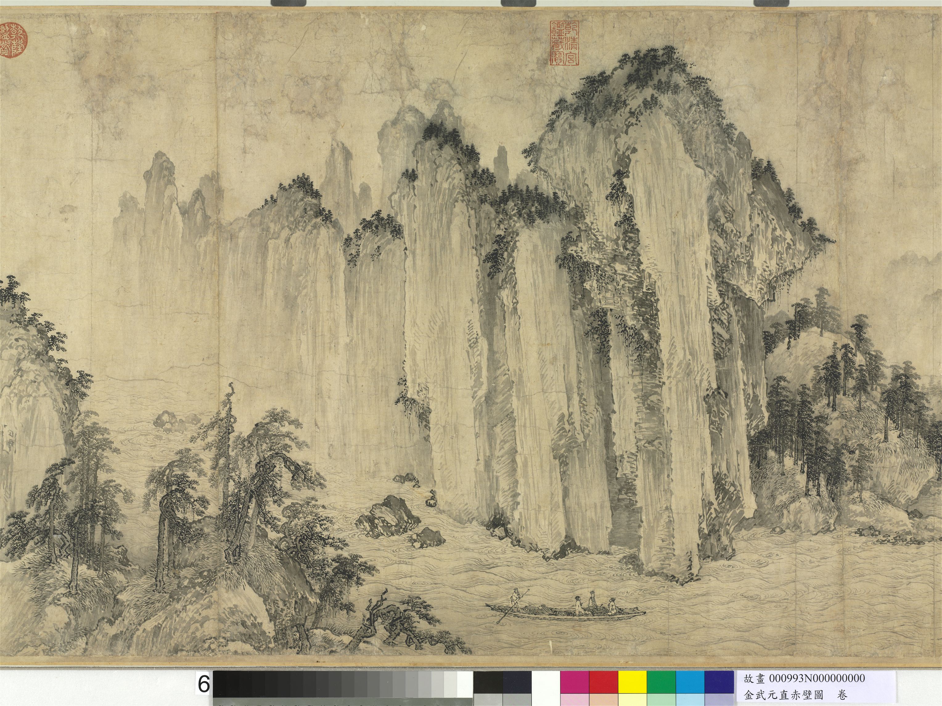 武元直(約活動於一一四九至一一八九)字善夫,號廣漠道人,以繪畫著稱於金代。此件手卷以蘇軾赤壁賦為母題,已見表現文學內涵的取向;筆墨技法亦不主於一家之學,不以模仿為能事。目前本院所藏赤壁圖中,以此幅時代最早,是追溯赤壁賦入畫不可忽略之作。