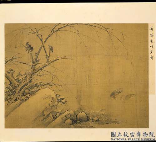 霧茫茫的江上,只見近景疊石坡岸,枯柳兩株,根部相交,上棲八哥四隻,細長的枝椏如垂釣者的釣線般抛向江面。梅、竹橫斜在柳石間,石濱蘆葦叢生,水面小水鴨一雙覓食,似聞其聲,一八哥注視著牠們,在寒天一片清寂中創造生趣。 構圖上主要實景偏於畫左,有夏珪(活動於西元1180-1230前後)「夏半邊」之意,但也借用延伸的柳枝和小水鴨,點綴了原為虛處的右方。全幅淡墨染底,表現冬日天色,染至竹樹、蘆葦的積雪處,以留白方式呈現,石面亦因積雪而醒目。作者並巧妙地在小水鴨邊用數筆鉤出波紋,點出了遼濶的江面。本幅原無名款,清代收藏家梁清標(1620─1691)收藏後始定畫題與作者為五代後蜀花鳥名家黃筌(約903-965),但其畫風以雙鉤填彩為主,與此實不相類。幅中石的線條和斧劈皴法,以及蘆葦和細枝的筆法,比之於夏珪「溪山清遠」,有其筆意,但不似夏珪之緊實,較為散逸而簡淡。另畫樹較不似夏珪之多轉折,並多乾筆。畫八哥以點染為主,具寫意趣味;小水鴨亦略鉤輪廓,再加點畫,筆簡意賅,均神韻生動。此作兼具夏珪和作者本身的風味,或為夏珪之後其一系畫風之作品。