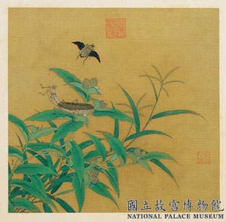 李迪(十二世紀)為河南孟縣人,工於花鳥竹石,曾任職於徽宗朝的畫院;靖康之變時亦南遷,在高宗(1127-1162)朝的畫院復職,並繼續服務至孝宗(1163-1189)、光宗(1190-1194)朝,為南宋早期宮廷花鳥竹石一類題材的代表畫家之一。此作最精彩的部分應屬精細的敷色豐富細膩的顏色使用,讓人幾乎忘了這是昆蟲追逐與逃脫生死瞬間的情節,而陶醉於畫中花葉與昆蟲小小軀體展現出的撩人感官魅力。