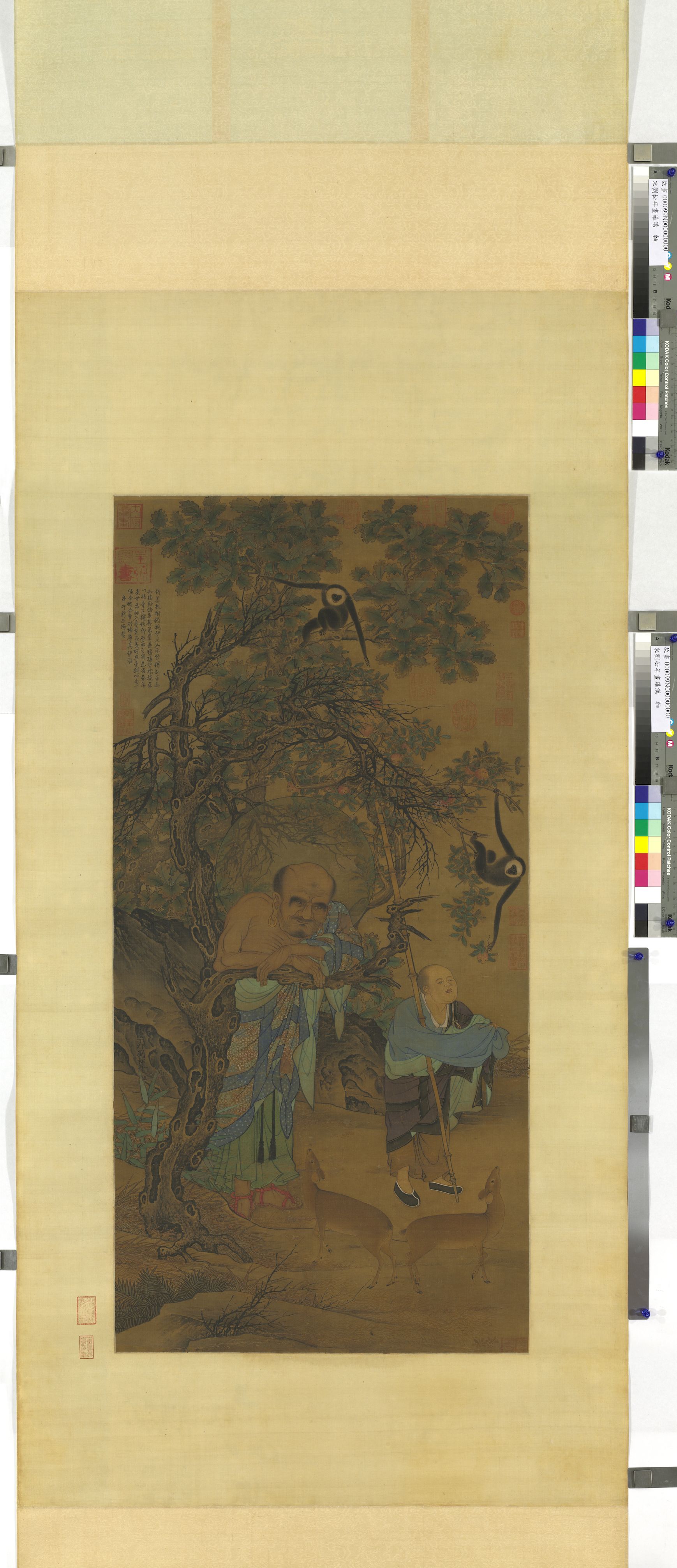 劉松年,生卒年不詳。錢塘(今浙江杭州)人。淳熙時(1174-1189)為畫院學生,紹熙年間(1190-1194)任待詔,寧宗時(1195-1224),賜金帶。師張敦禮,工畫山水、人物,與李唐、馬遠和夏珪合稱為「南宋四大家」。 此軸畫一尊者倚樹沉思,隨侍的小沙彌以衣袂承接長臂猿所摘的石榴,足前尚有兩隻鹿仰頭而望。這尊羅漢的形貌古野,但卻不怪異誇張。畫中人物的神情姿態都描繪得栩栩如生,寫實性強。敷彩妍麗卻不失古雅,人物用筆清勁,衣紋線條時而流暢,時而方折,變化多端。羅漢的頭光與身後樹枝、石壁和屏風掩映,層次分明,展現出高超的寫實技巧。