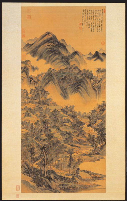 王時敏(1592-1680),江蘇太倉人。字遜之,號煙客,又號西廬老人、西田主人、偶諧道人、歸村老農等。他出生書香世家,父親與祖父都曾擔任明朝官職,髫齡(約七歲)即得家庭教師董其昌的教導,為清初正統派「四王」之一。本幅下半部描繪山中屋舍錯落、林木繁密、溪水湍流之景;間隔著山嵐雲霧,上半則是三角形狀層層向後疊加的巨大山體。以濕潤、綿長的披麻皴法勾勒岩石與山體輪廓,再罩染赭石和汁綠,使畫面更為明亮並具裝飾性。