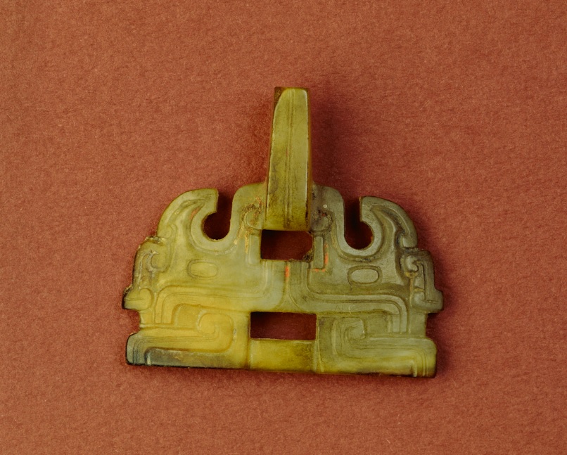 1.本器係造形相當特殊之春秋時代玉器,其正視動物面紋形象雖可溯自新石器時代,但其鼻部有一長條形凸出,與舖首之造形相當類似,疑似舖首形玉器之早期階段作品,具研究價值。 2.本器出土於輝縣琉璃閣甲墓,考古出土地點明確,時代性非常確鑿,可作為古玉研究的指標性作品。 3.春秋時期此項造型尚未發現,高雕技法及透雕的技法均相當熟練。 4.嵌飾器的器型是一塊完整玉料所完成,設計造型獨特,疑似早期玉舖首的重要資料,在春秋玉器史上,有其地位及意義。