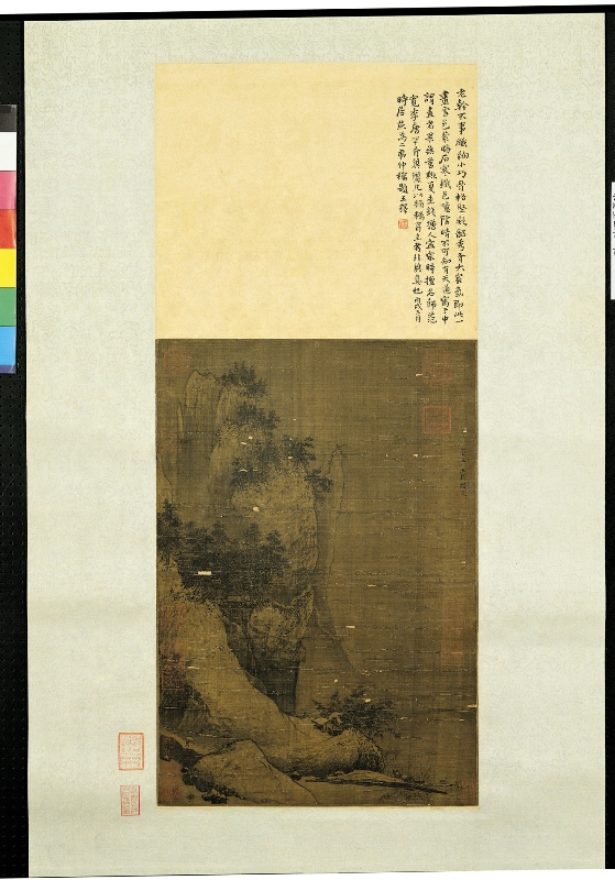 本幅無款印,右緣小字書:夏圭。王鐸鑑定。詩塘王鐸跋(1646)定為夏珪。現代學者據畫風及王鐸所鑑,定為夏圭之作,呈現由北宋范寬,至北宋末李唐之影響,南宋馬夏山水轉變之間重要作品。具有重要之時代特色、技術及流派。