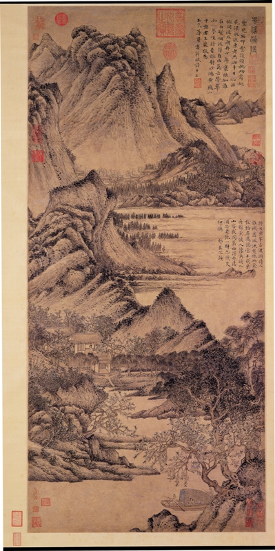 王蒙(1308-1385),吳興(浙江湖州)人,字叔明,號黃鶴山樵,趙孟頫外孫。畫風以王維、董、巨為宗,為元四大家之一。此圖寫霅溪風景,款題為玉泉尊舅作。