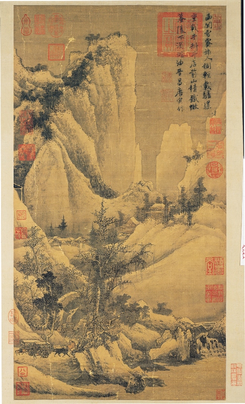 唐寅(1470-1523),吳縣(今江蘇蘇州)人。字子畏,又字伯虎,號六如。天賦多才,個性狂逸不羈。弘治十一年,中南京鄉試解元。詩、書、文章、繪事無一不臻其妙。畫師周臣,而有出藍之譽,為明四大家之一。 畫積雪巖關,旅人驅車而行。通幅大抵以斧劈皴皴寫,勁利瀟灑,間雜披麻、長皴等,南北兼參,皴法變化多端。此圖雖無年款,但據其畫風,疑為唐氏三十八歲左右之作。