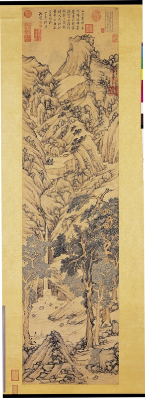 文徵明(1470-1559),江蘇長洲(今江蘇蘇州)人。初名壁,字徵明,後以字行。亦字徵仲,號停雲生、衡山居士。詩文、書畫並佳,畫師沈周,為明四大家之一。 本幅成於庚戌年(1550),為文徵明八十一歲之作。畫重巒飛瀑,二人樹下對坐,一琴童旁侍。此幀紙狹而長,構景重疊而繁複,設色溫雅,筆意秀婉。徵明晚年好作此類繁景細筆之作,對吳派晚期畫家影響甚鉅。
