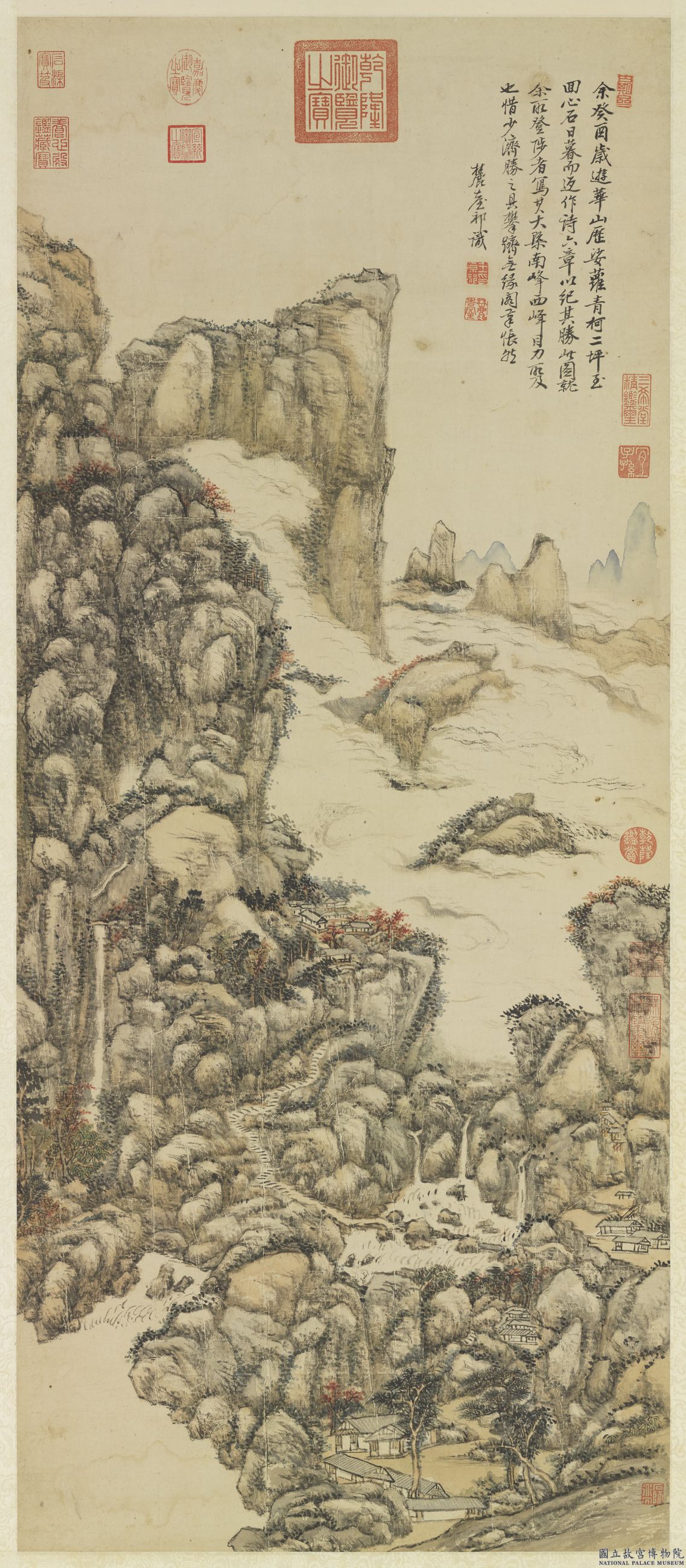 此軸根據王原祁遊歷華山的親山經驗作成,融合元四大家中黃公望慣用的卵石樊頭,加以王蒙獨特的細筆牛毛皴法與動態山體構成,體現王氏巧妙轉化古人畫法後,融會個人經驗的精心傑作。而此圖繪概念也成為日後婁東派不斷沿用的創作基礎。具有重要之時代與流派特色、藝術價值。