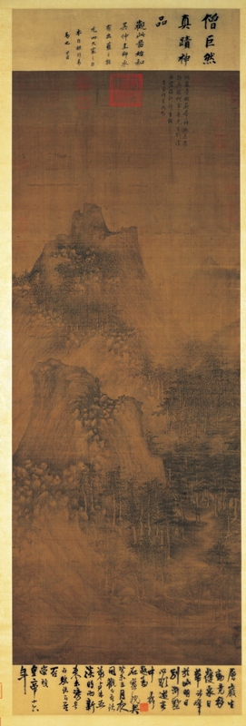巨然(活動於十世紀後期),鍾陵(今南京)人。南唐滅亡,隨李後主降宋至汴京,以畫山水有名。此軸表現江南林木挺勁、煙嵐繚繞的氣象,描繪鬆軟土石的披麻皴與山頭卵石的礬頭,皆為「董巨畫派」典型特徵。「之」字形路徑蜿蜒縈迴深入山中,增添了畫面的縱深感。詩塘上方董其昌(1555-1636)將此圖訂為「僧巨然真蹟神品」,畫上鈐有北宋、南宋、明初「宣和殿寶、尚書省印、司印(半印)」官印。