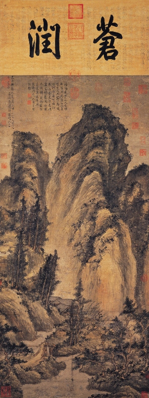 方從義(約1301-1378後),字無隅,號方壺、上清羽士,江西龍虎山上清宮道士。年輕時隨金蓬頭學道,後出遊往大都,遍覽道教名山。在大都時盡觀權貴收藏。根據款題,本幅作於至正二十五年(1365),為南溟真人程元翼畫。圖繪江西龍虎山瓊林一帶,為方氏晚年隱居處。方從義畫以宋代米家山水為師,而更顯蕭散。本幅運用深淺濕潤筆墨,奔放的線條及墨點,塑造山石,山水頗具動態。