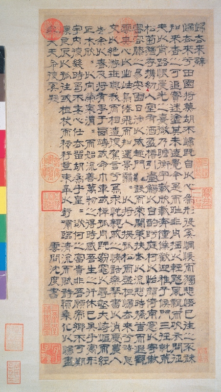 沈度是明永樂至宣德初年重要的宮廷書家,擅長各體書,書風婉麗典雅,有「館閣體」之稱。此幅可視為他隸書的重要作品。傳世有大字隸書題寫書畫引首之作,如此幅長篇隸書不多見。全幅行間嚴密,運筆規矩中,而有生意,開明代隸書之典型。具有重要之時代與流派特色、藝術價值。