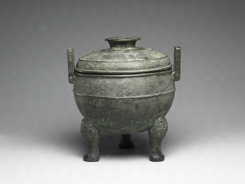 通高27.1cm、腹深16cm、口徑19.9cm、腹圍73.5cm。 材質:銅。 蓋器均飾蟠虺紋,足飾獸面紋。蓋內有銘文30字。
