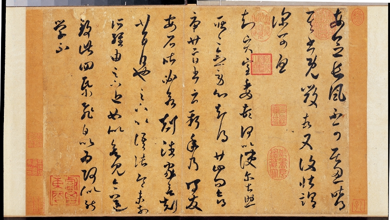 此卷昔日歸在唐褚遂良名下,實為宋人雙鉤廓填之作,所據底本為王羲之〈長風〉、〈知賢室〉、〈四紙飛白〉三帖。全卷點畫位置準確,牽絲帶筆呼應有情,以致於學界評為鉤摹佳本,或且以為可能和宋四家之一米芾有所關聯。王羲之草書面貌,多賴刻帖和摹本保存下來,凡鉤摹精到足以逼真的摹本,書史視為「下真蹟一等」,此卷可當之無愧。此卷雖然出於宋人,猶可追想王羲之風神韻味,相當難得。此外,本作有宋徽宗的收傳印,又有明代曾棨、董其昌、王廷相、汪道會的題跋,是一件流傳有緒的重要書法作品。