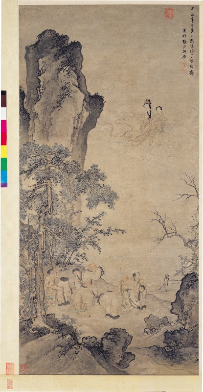 張渥(活動於十四世紀中葉),擅長人物,法李公麟白描得其清麗流暢之風。元代蒙古人崇信道教,瑤池乃西王母之寓所,畫中所見女仙為西王母,頭戴華冠、乘風駕雲而來、侍女手捧仙桃,二人俯視商山四皓,其旁童子歡欣鼓舞,取長壽吉祥之意。